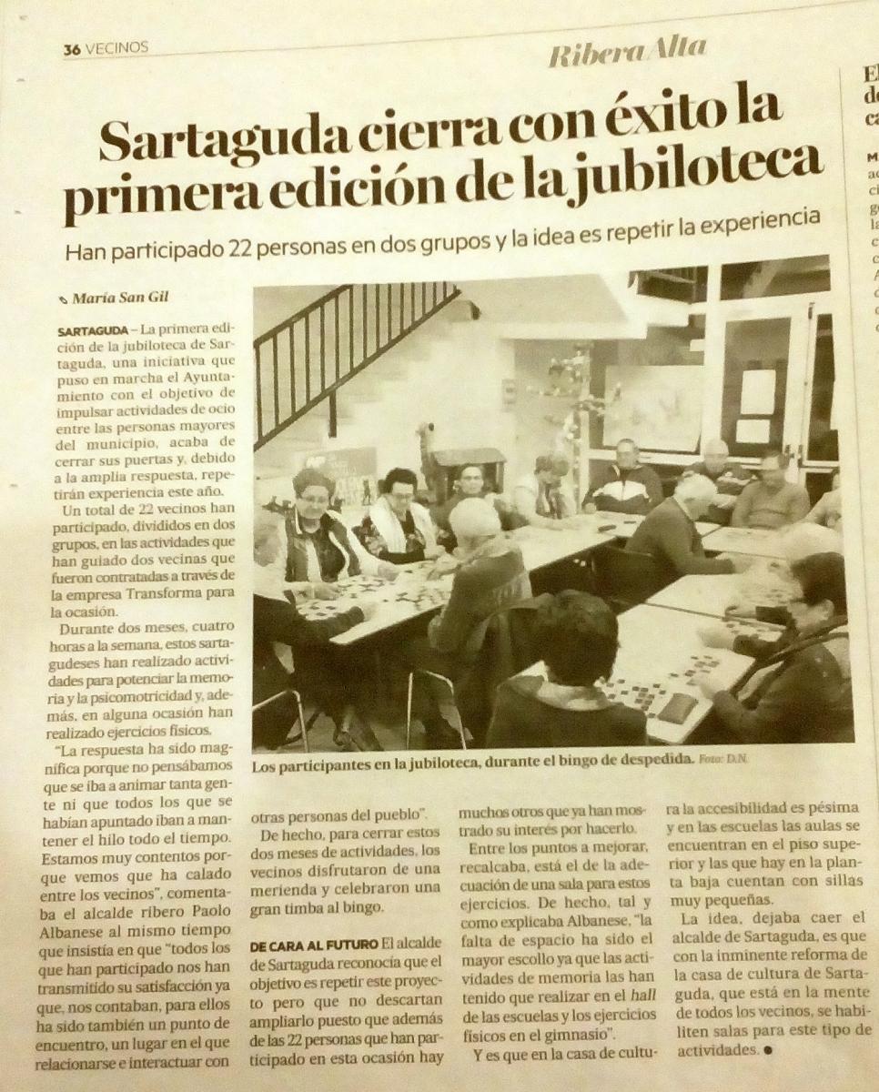Durante 2 meses se ha ofrecido el servicio, que incluye actividades para potenciar la memoria, psicomotricidad, y en ocasiones también ejercicio físico. Un total de 22 personas han participado en la Jubiloteca gestionada por Transforma en Sartaguda.